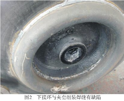搪玻璃特種設(shè)備的上接環(huán)下接環(huán)與夾套組裝的對接接頭焊接過程、焊接質(zhì)量難以控制,圖1為上接環(huán)與夾套組裝有裂紋;圖2為下接環(huán)與夾套組裝有缺陷;圖3為上接環(huán)與夾套組裝的示意圖。